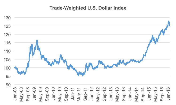 Note: The trade-weighted US dollar index is calculated as a weighted average of the foreign exchange value of the US dollar against the currencies of a broad group of major US trading partners. Source: Federal Reserve Bank of St. Louis.