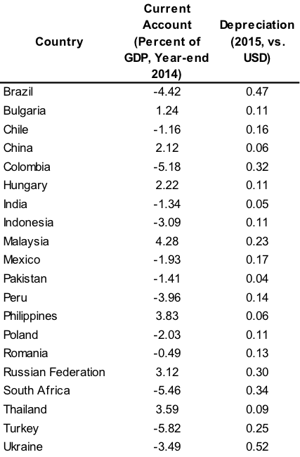 In anticipation of Federal Reserve rate hikes, emerging-market currencies faced an onerous environment in 2015. To get a sense of the magnitude of currency depreciations over the course of the year, Table 1 below lists the current account as a percentage of GDP at the end of 2014 and currency depreciation for twenty emerging markets over 2015.[xiii] Since the foreign exchange rates are measured in terms of domestic currency versus USD, a positive value of depreciation indicates that the currency weakened. The data show that the currencies of countries that started 2015 with higher current-account deficits faced more severe depreciation on average. This pattern is similar to trends seen during the “taper tantrum” in 2013 when Federal Reserve Chairman Ben Bernanke merely suggested that the Federal Reserve may begin to slow down the pace of its asset purchases.[xiv] In the wake of the announcement, emerging-market currencies sold off dramatically and risk aversion quickly spread.[xv] The “fragile five,” a group of emerging-market countries (Brazil, India, Indonesia, South Africa and Turkey) with high current-account deficits and a reliance on foreign capital inflows, faced particularly severe outflows and currency depreciation.[xvi]
