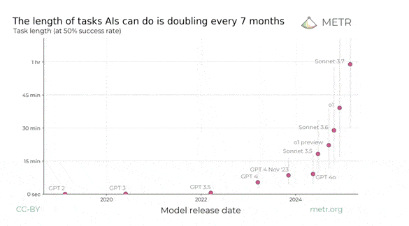 Furthermore, in a March 2025 blog post titled “Measuring AI Ability to Complete Long Tasks,” METR introduced the “50% task-completion time horizon”, the amount of time a human expert spends on a task that an AI can now complete successfully half the time.[11] This horizon has doubled roughly every seven months, showing that AI systems are rapidly extending the length and complexity of tasks they can perform autonomously. For policymakers, this offers a concrete way to track AI’s exponential progress and anticipate its impact on labor and regulation. But, like all exponential trends, it will eventually slow as limits in power, chip abundance / capability, and data availability constrain further growth.